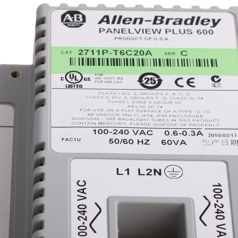 The 2711P-T6C20A is a Panelview Plus 600 Operator Terminal. This operator terminal is powered by an external 85-264V AC supply voltage and has a 5.5-inch colored display with embedded Ethernet, RS232 and USB ports. |
