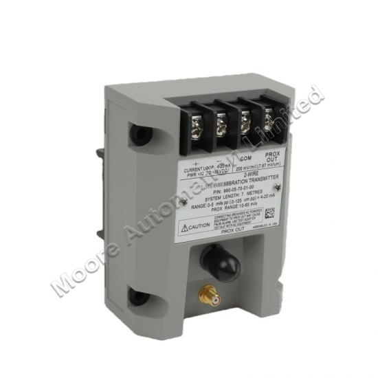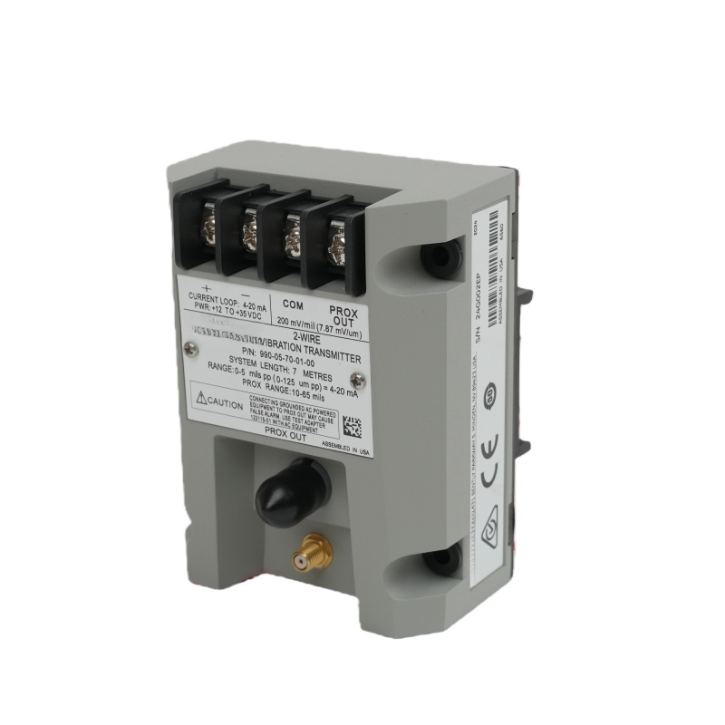 The 990-04-07-01-05 is a vibration transmitter manufactured by Bently Nevada, belonging to the 990 series. It is suitable for mechanical control systems in equipment such as centrifugal air compressors, small pumps, motors, or fans.
