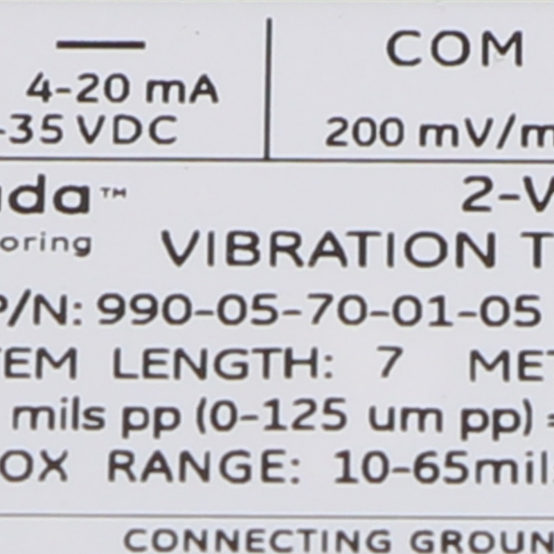 The 990-05-70-01-05 990 Vibration Transmitter is intended primarily for the original equipment manufacturers (OEMs) of centrifugal air compressors or small pumps, motors, or fans who prefer to provide a simple 4 to 20 mA proportional vibration signal as the input to their machinery control system. The transmitter is a two-wire, loop-powered device that accepts input from our 3300 NSv proximity probe and its matching extension cable (available in 5 m and 7 m system length options).The transmitter conditions the signal into appropriate peakto-peak vibration amplitude engineering units, and provides this value as a proportional 4 to 20 mA industry-standard signal as the input to the control system where machinery protection alarming and logic occurst.